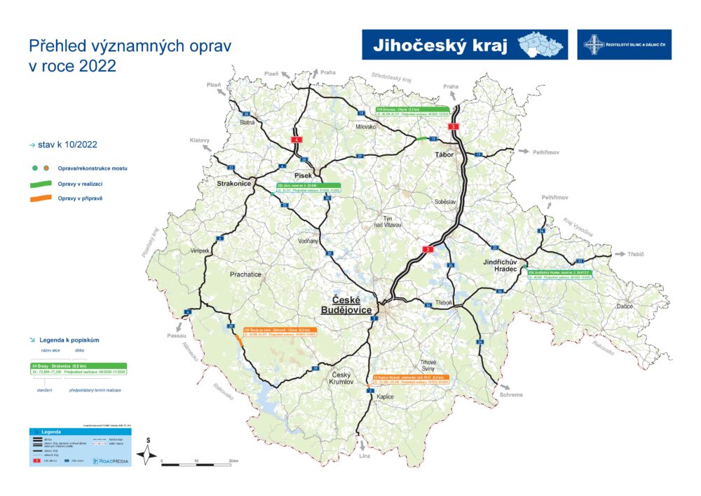 Aktualizovaná mapa významných oprav ŘSD plánovaných a realizovaných v rámci Jihočeského kraje. Na zahájení ještě čekají dvě větší akce, a to oprava škod po zimní sezóně na I/39 a odstranění bezpečnostních rizik na vybraném úseku I/3 v Kaplici Nádraží. Zde ale budeme v letošním roce nejspíš provádět pouze práce převážně mimo hlavní komunikaci a nemělo by tak dojít k výraznému omezení provozu.