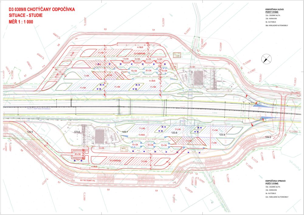 Během příprav na výhledové rozšíření odpočívky by tak mohly být v rámci aktuálních stavebních úprav provedeny i hrubé terénní práce, které by sloužily jako příprava pro vybudování potřebných parkovacích ploch. Drtivou většinou pozemků potřebných pro velkou odpočívku už se ŘSD ČR podařilo vykoupit. Samotné terénní úpravy již byly povoleny v rámci územního rozhodnutí pro stavbu „D3 0309/II Ševětín – Borek“ a jsou také v souladu s územním plánem obce Chotýčany na budoucí rozšíření parkovacích ploch. ŘSD ČR tak již nyní může na svých pozemcích úpravy realizovat.