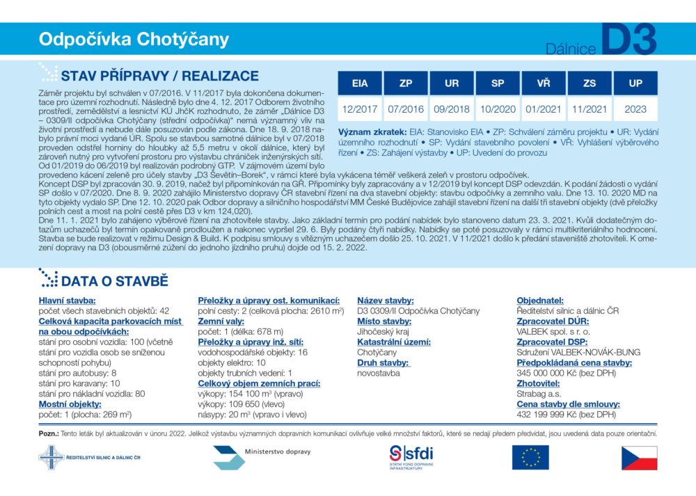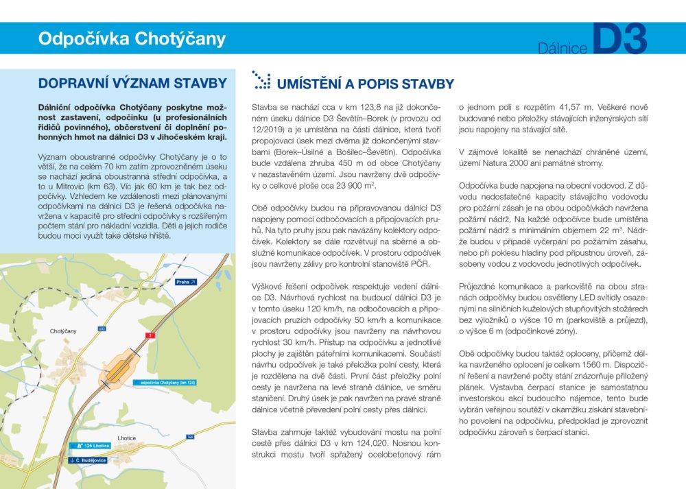 V polovině února byly zahájeny stavební práce na jedné z velice očekávaných akcí na dálnici D3, a to na stavbě oboustranné odpočívky Chotýčany. Význam samotné odpočívky je o to větší, že po jejím dokončení se bude jednat o teprve druhou odpočívku na celém 70 km dlouhém úseku současné D3.