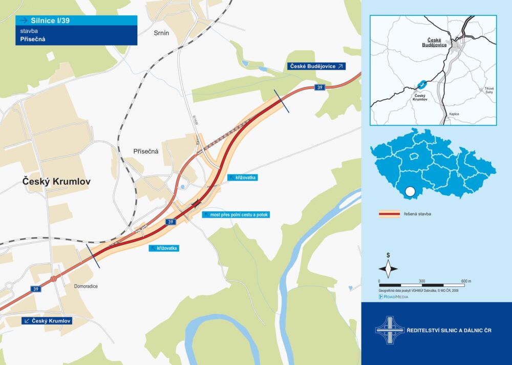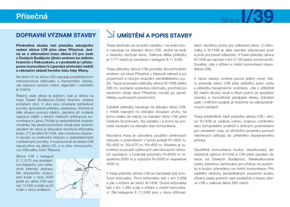 Mezi Českými Budějovicemi a Českým Krumlovem vede komunikace I/39 převážně mimo obce, které se na trase nebo poblíž zmíněné trasy nacházejí. Jedinou výjimkou je obec Přísečná těsně před Českým Krumlovem. Zde silnice vede přímo průtahem obce. Plánovaná stavba I/39 Přísečná by výhledově měla tuto situaci změnit.