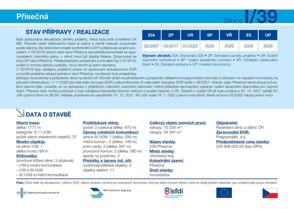 V současné chvíli má stavba pravomocné územní rozhodnutí, které právní moci nabylo na konci února. ŘSD ČR tak může dále pokračovat v přípravách na realizaci řešené stavby. Pokud vše půjde bez větších komplikací předpokládáme zahájení stavebních prací v průběhu roku 2026.