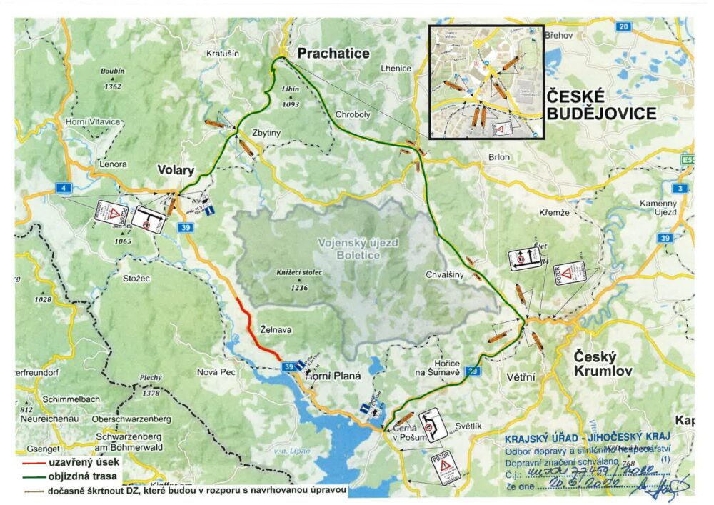 Samotná oprava bude probíhat po polovinách a provoz bude v místě prací veden kyvadlově. Vzhledem k šířkovému uspořádání komunikace bude ale průjezd stavbou povolen pouze vozidlům do 3,5 tuny a vozidlům veřejné dopravy. Ostatní vozidla nad 3,5 tuny budou muset využít objízdné trasy přes Kájov, Chvalšiny, Prachatice a Volary, tedy po silnicích I/39, II/166, II/143 a II/141