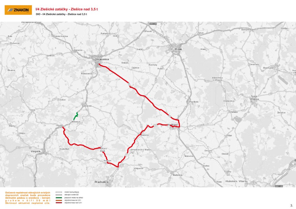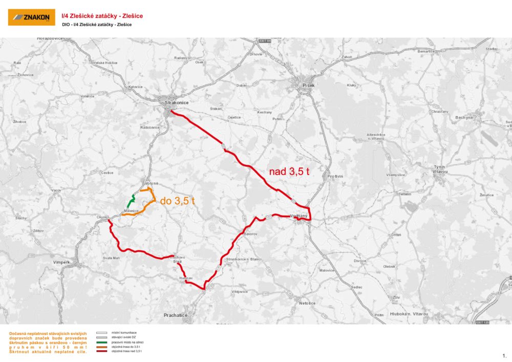 Stavební práce si vyžádají úplnou uzavírku komunikace I/4. Vozidla do 3,5 tuny budou muset využívat objízdnou trasu přes obce Nišovice, Černětice a Malenice. Vozidla nad 3,5 tuny pak budou muset mezi Strakonicemi a Vimperkem využívat delší objízdnou trasu po komunikacích I/22 a II/141. Na objízdné trasy budou řidiči upozorněni provizorním dopravním značením.