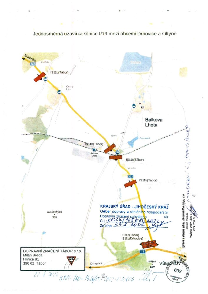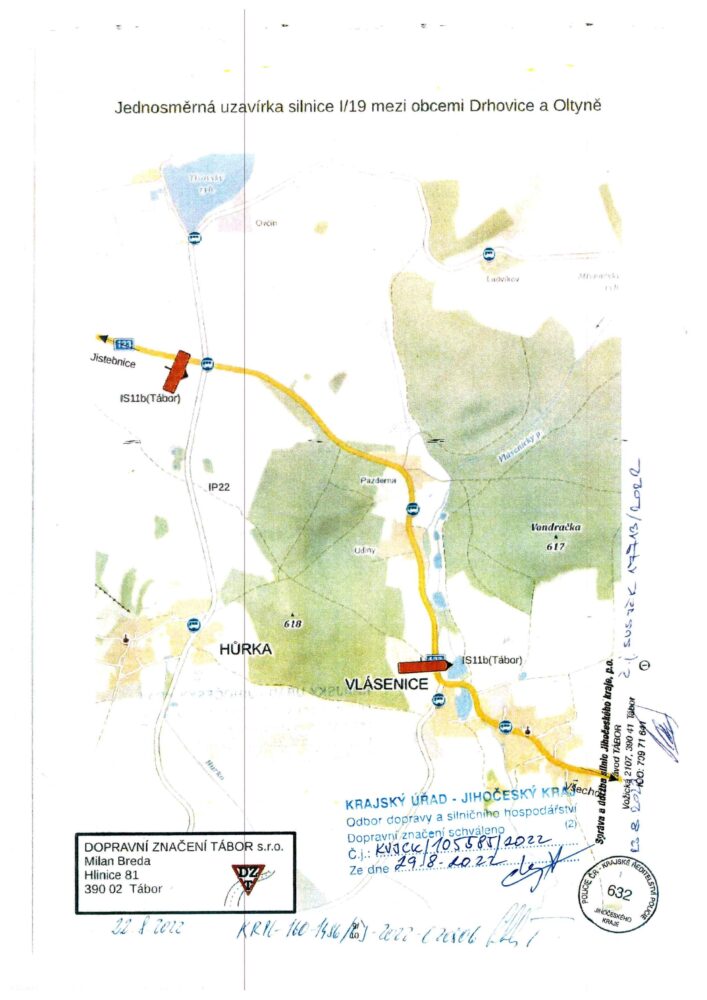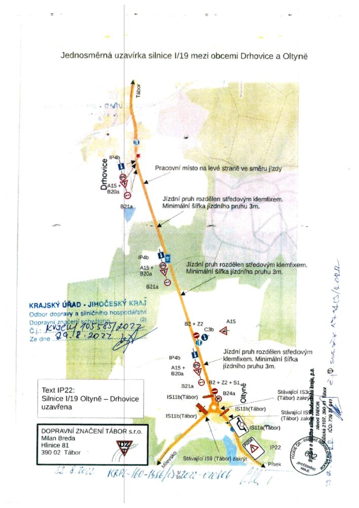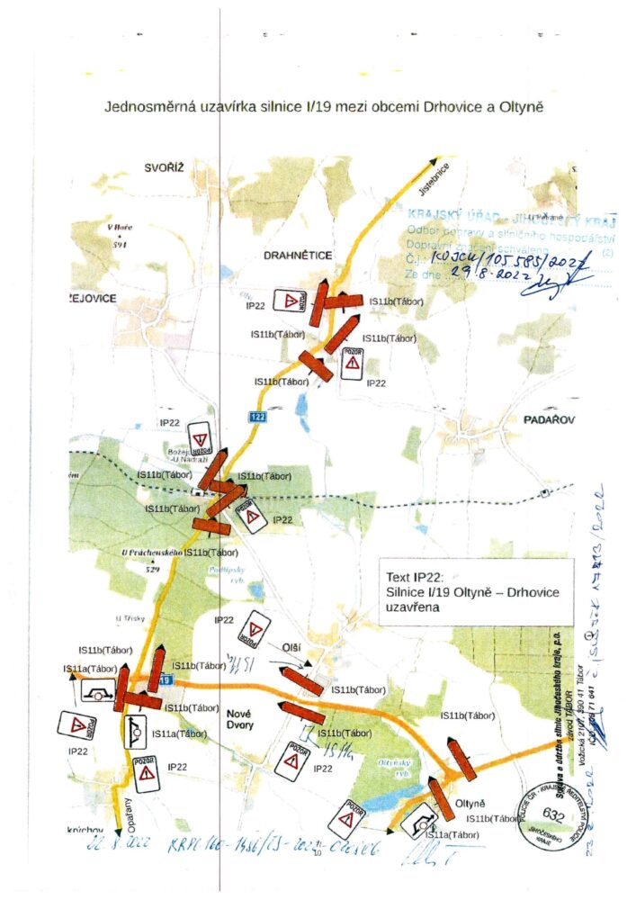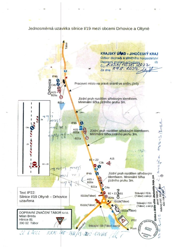 Ve čtvrtek 8. 9. 2022 bude zahájena oprava silnice I/19 v rámci akce I/19 Oltyně – Drhovice na Táborsku.