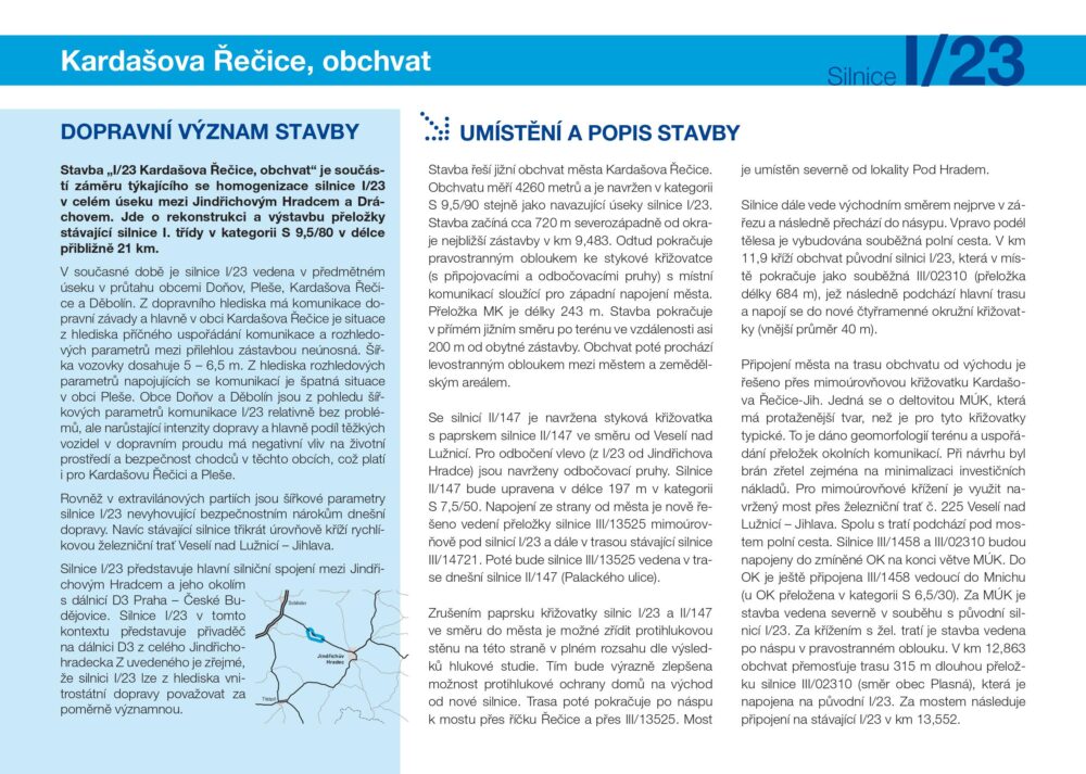 Plánovaná přeložka silnice I/23 mimo zastavěné území města do budoucna výrazně zlepší dopravní situaci v řešeném úseku. Odvedením tranzitní dopravy mimo město se také zvýší bezpečnost provozu na komunikaci, ale také v samotném městě Kardašova Řečice.