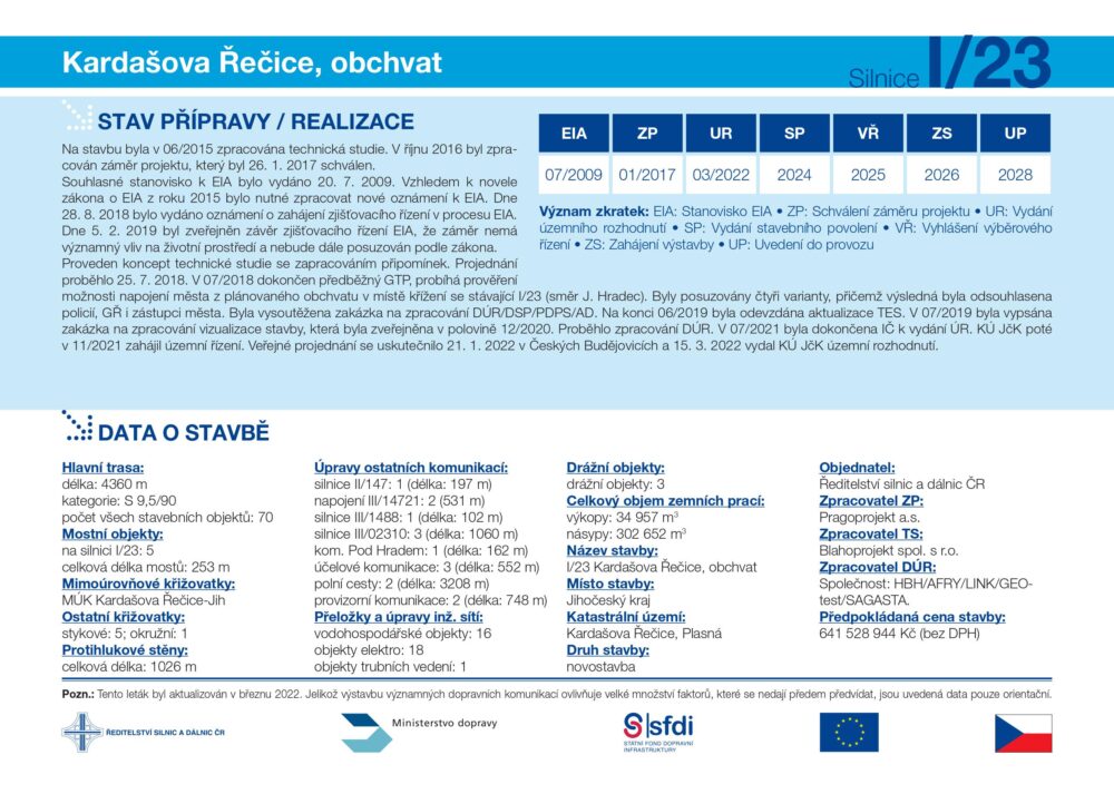 V rámci příprav realizace přeložky bylo nyní na stavbu I/23 Kardašova Řečice, obchvat Krajským úřadem Jihočeského kraje vydáno územní rozhodnutí. Pokud budou přípravy i nadále probíhat bez výrazných komplikací plánuje ŘSD ČR zahájit stavbu obchvatu v průběhu roku 2026.