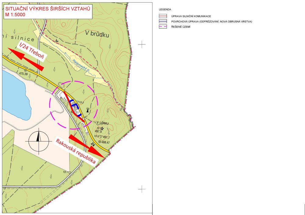 Řešený prostor je v současné chvíli bez většího využití a z části zarostlý zejména náletovými dřevinami. Povrch vozovky je zde ve špatném stavu. V místě stavby se také nachází přístřešek bývalé celnice. Postupně dojde k odstranění jak zmíněných dřevin, tak bývalého přístřešku celnice. Následně dojde k rekonstrukci samotné vozovky. Podoba stávající větve komunikace zůstane do značné míry zachována. K účelu kontroly vozidel a k zajištění bezpečnosti nicméně dojde k celkovému rozšíření vozovky. Po obou stranách jsou navrženy i parkovací pruhy, které budou v době provádění kontrol sloužit k parkování vozidel policie.