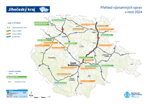 Aktualizovaná mapa plánovaných a probíhajících oprav, tentokrát za červenec 2024. V současné chvíli probíhá deset větších akcí. V následujících dnech pak budou zahájeny další dvě akce, a to I/22 Jinín – Cehnice a I/19 Tábor Jordán, zajištění skalního výchozu.