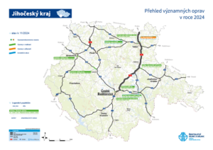 Aktualizovaná mapa plánovaných a probíhajících oprav v Jihočeském kraji, tentokrát za listopad 2024. V podstatě už jen dokončovací práce probíhají na stavbách I/24 Třeboň, mosty ev. č. 24-007 a 24-007.2, I/3 České Budějovice – Diamant, úprava křižovatky a I/34 Ramena na MÚK Hůry.