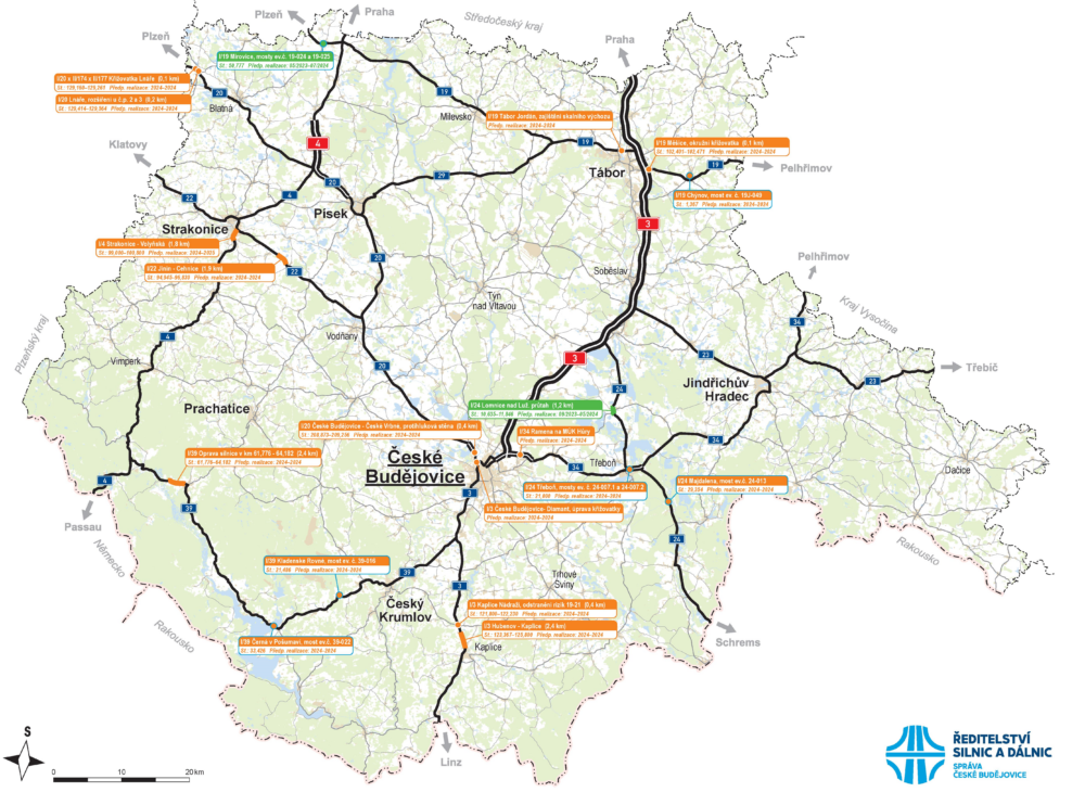 Přehledná mapa s akcemi plánovanými na letošní rok v Jihočeském kraji. V letošním roce chceme zahájit sedmnáct důležitých staveb. Další dvě už probíhající opravy pak budou během roku dokončeny.