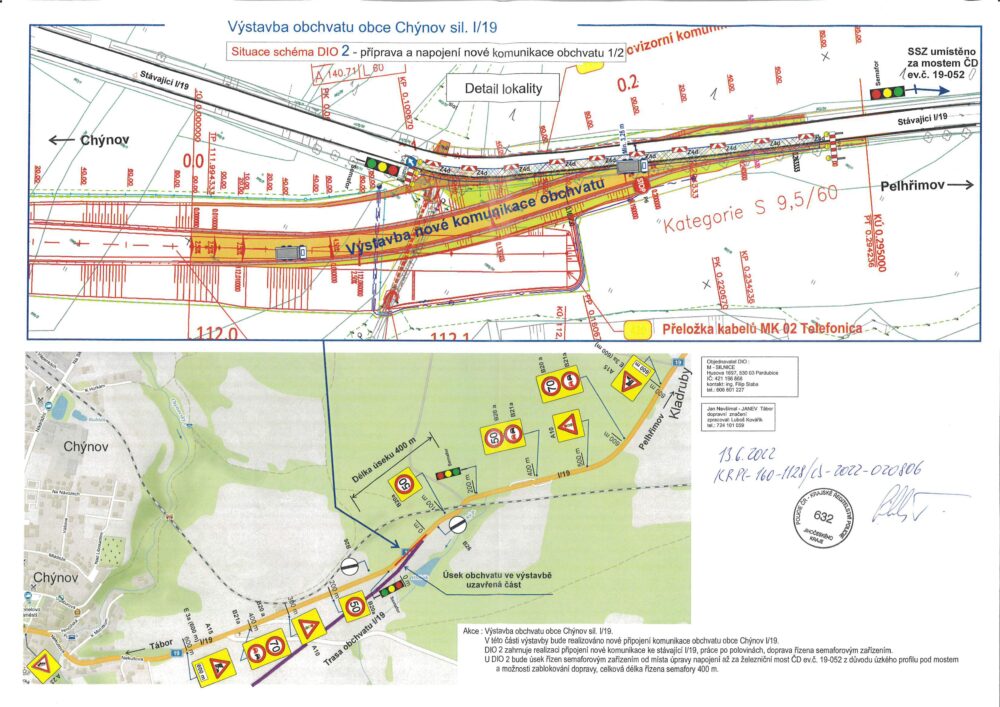 Od pondělí 18. 7. 2022 dojde na silnici I/19 za Chýnovem směrem na Pelhřimov k dalšímu omezení provozu. Až do 1. 8. 2022 bude ve zhruba 400 metrů dlouhém úseku u železničního přejezdu doprava svedena pouze do jednoho jízdního pruhu a provoz bude v řešeném úseku veden kyvadlově pomocí semaforů.