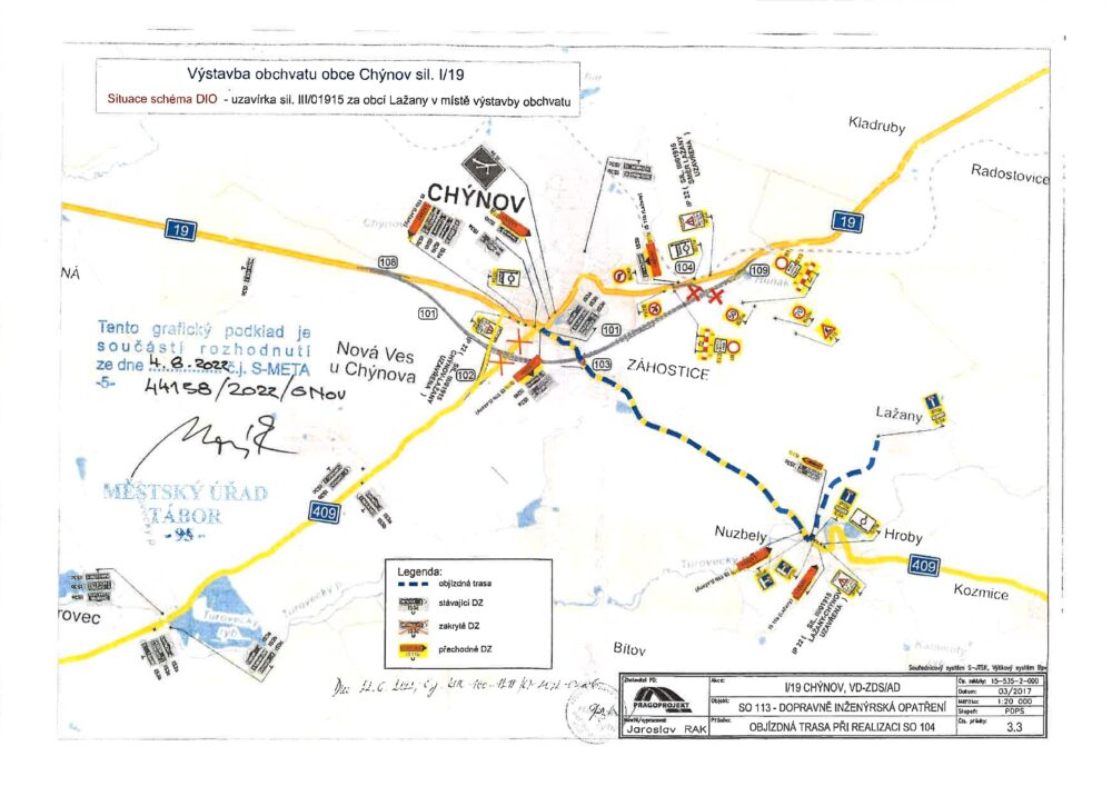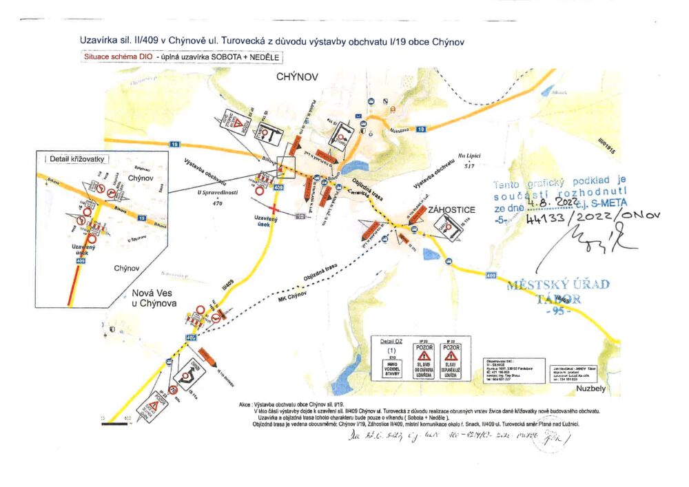 V termínu od 24. 8. 2022 do 25. 8. 2022 následně proběhne úplná uzavírka silnice III/01915 s objízdnou trasou obousměrně po I/19, II/409, místní komunikaci a III/01915 přes Chýnov, Záhostice, Hroby a Lažany.