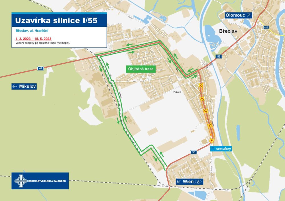 Hraniční ulice bude během opravy neprůjezdná a řidiči budou jezdit po objízdné trase, která vede po souběžných místních komunikacích viz mapka. Objízdná trasa začíná u křižovatky třídy 1. máje s ulicí Jana Skácela, pokračuje ulicí Na Valtické a odbočkou před železničním přejezdem do ulice Díly, podél kolejí Nádražní ulicí. Polní cestou, která bude pro potřeby objížďky nově zpevněná, projedou řidiči kolem areálu společnosti Lamé, kudy se opět dostanou na silnici I/55.