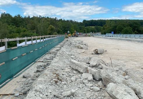 Foto zachycuje bourání betonové hrany mostu.
