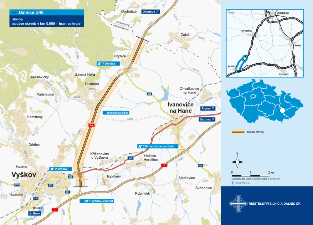 Ředitelství silnic a dálnic (ŘSD) zmodernizovalo téměř sedm kilometrů dálnice D46 u Vyškova v Jihomoravském kraji. Úsek zprovozní 9. listopadu. Jde o šest staveb včetně upravené mimoúrovňové křižovatky Vyškov. Díky modernizaci se zlepšily parametry tohoto dálničního úseku. Část dálnice může fungovat i jako runway pro stíhací letouny. Práce, které začaly na jaře, stály 461 milionů Kč bez DPH.