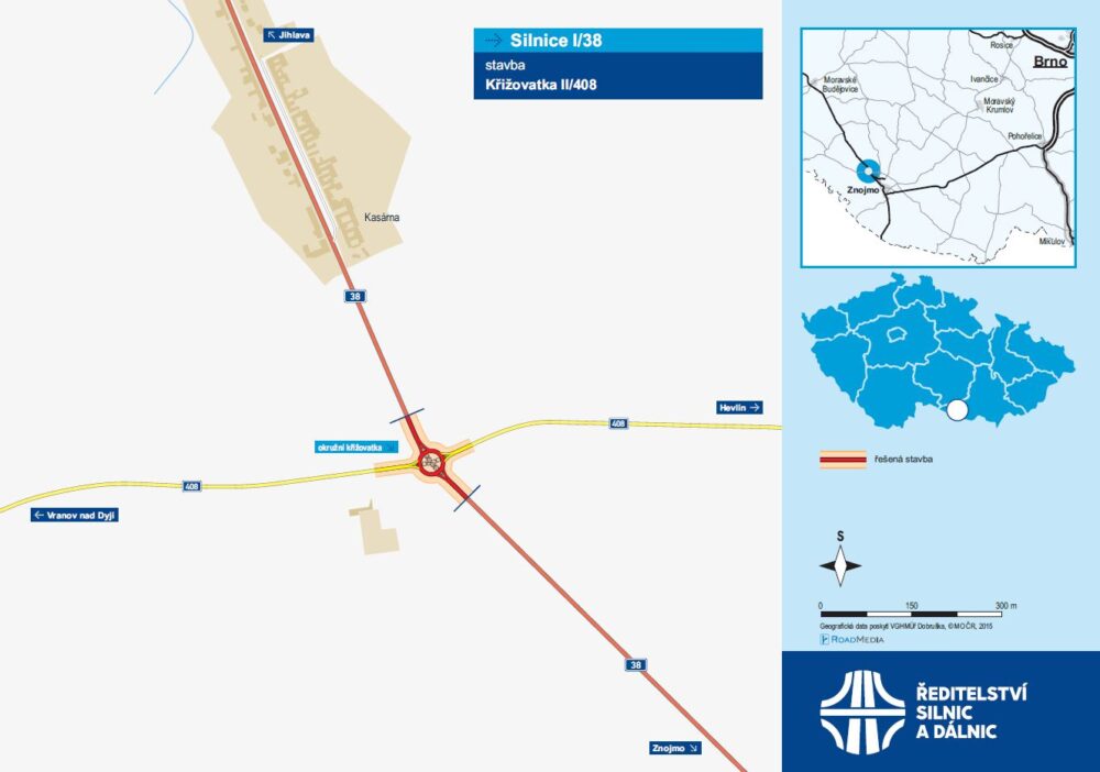 Zahájili jsme výběrové řízení na zhotovitele stavby okružní křižovatky silnic I/38 a II/408 u obce Kasárna na Znojemsku. Realizaci stavby plánujeme v této stavební sezóně. Cílem je zvýšení bezpečnosti v nepřehledném úseku. Provoz bude veden po provizorních komunikacích.