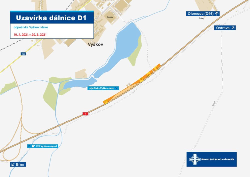 Na dálnici D1 u odpočívky Vyškov bude od soboty 10. 4. do 20. 6. uzavřen odstavný jízdní pruh a část pravého jízd. pruhu v km 228,250 – 227,070 ve směru na Brno. Důvodem je stavba gabionové zdi pro odhlučnění a odstínění prostoru odpočívky. Projedete levým jízdním pruhem.