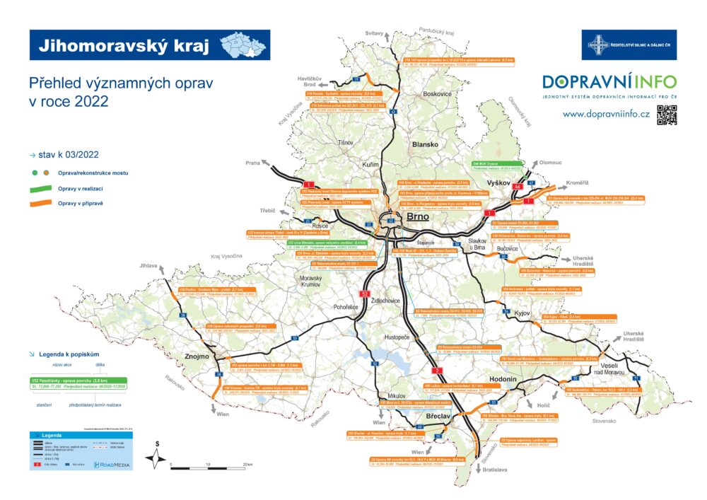 Opět přinášíme aktualizovaný přehled oprav na dálnicích a silnicích I. tříd, které v letošní stavební sezóně plánujeme realizovat na území Jihomoravského kraje. O zahájení stavebních prací a souvisejících dopravních omezeních budeme řidiče průběžně informovat.