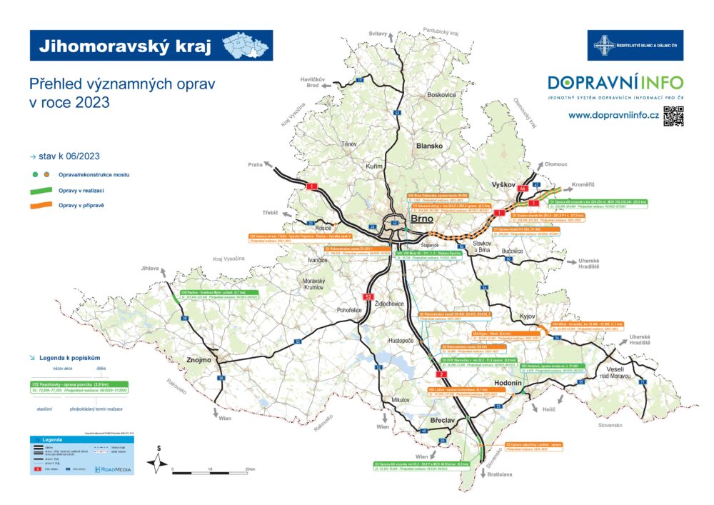 Aktualizovaný přehled realizovaných a připravovaných oprav dálnic a komunikací I. třídy na území Jihomoravského kraje. Přesné termíny zahájení jednotlivých akcí a související dopravní omezení budeme průběžně upřesňovat.