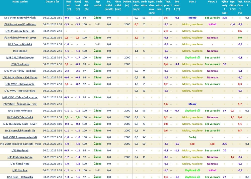 Dálnice a silnice I. tříd v Jihomoravském kraji jsou dnes ráno mokré, nasolené. Ačkoliv jsou vozovky chemicky ošetřené, upozorňujeme řidiče na riziko tvorby námrazy a náledí! Zvýšenou opatrnost doporučujeme zejména v těchto úsecích komunikací: I/54 Silničná, I/19 Rozseč nad Kunštátem, I/43 Černá hora a VMO v Brně viz přehled níže.