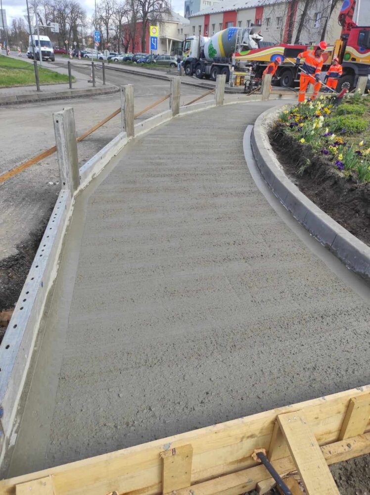Pohled na dnešní betonáž vnitřního prstence okružní křižovatky v Hodoníně, kde nahrazujeme původní kostky za betonový kryt. Stále je uzavřeno ¾ křižovatky. Provoz na silnici I/51 je veden kyvadlově. Dokončení prací plánujeme 20. dubna.