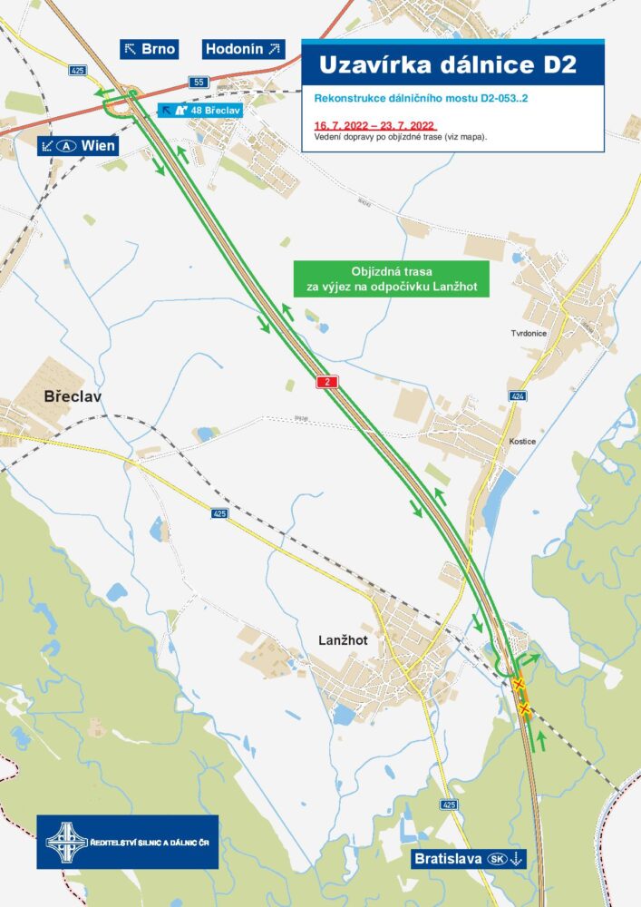 Upozorňujeme řidiče, že od sobotního rána bude částečně uzavřena dálnice D2 v km 56,2 ve směru na Brno. Omezení potrvá do 23. 7. Důvodem je záruční oprava povrchu dálničního mostu. Pracovat budeme po polovinách. Ve směru na Brno budete vždy projíždět jedním jízdním pruhem. Vjezd na odpočívku Lanžhot bude možný pouze po objízdné trase (viz mapka níže).