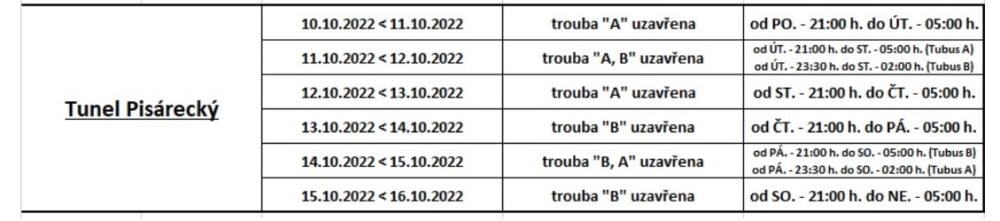 Podzimní údržba v Husovickém tunelu je hotová. Dnes se v 21:00 přesuneme do Pisáreckého tunelu. Zde budou údržbové práce probíhat během nočních uzavírek vždy v době od 21:00 do 5:00 do neděle 16. října. Následně přijde na řadu Královopolský tunel.