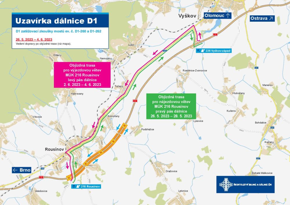 Upozorňujeme na omezení provozu na dálnici D1 v km 215, 7 – 220 z důvodu zatěžovacích zkoušek dvou mostů viz mapka níže. Od dnešních 22:00 do nedělních 10:00 bude uzavřen jízdní pás dálnice D1 ve směru na Olomouc, včetně nájezdové větve MÚK Rousínov (EXIT 216). V termínu od 2. 6. do 4. 6. bude uzavřen jízdní pás ve směru na Brno, včetně výjezdové větve MÚK Rousínov. Provoz bude veden v jednom jízdním pásu v režimu 1+1 a po objízdných trasách.