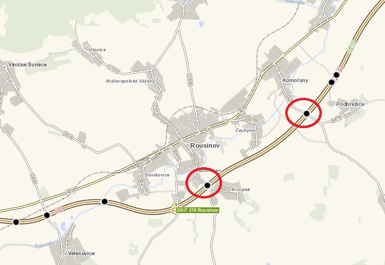 - za uzavřenou výjezdovou větev MÚK Rousínov (EXIT 216) vlevo od 2. 6. do 4. 6.: objízdná trasa vede z MÚK Vyškov – západ (EXIT 226) – po silnici II/430 (Tučapy, Komořany, Rousínov) – silnici III/0476 (Rousínov)