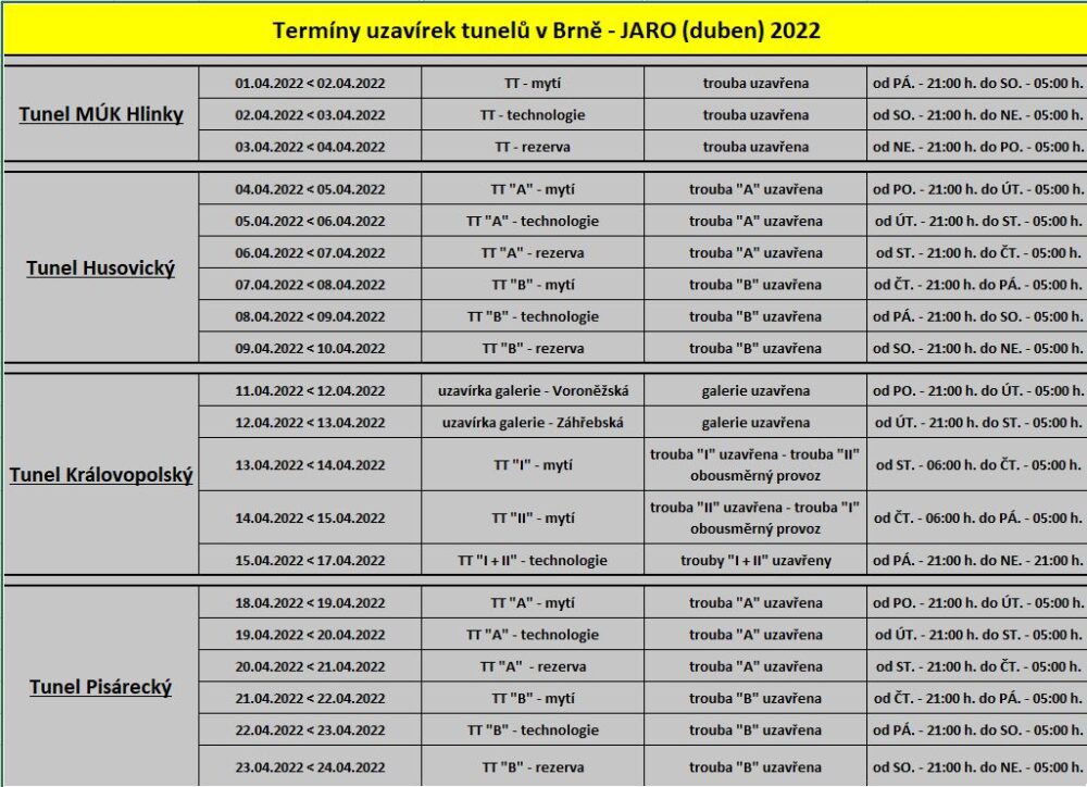 Během měsíce dubna nás čeká běžná údržba brněnských tunelů, a to MUK Hlinky, Pisáreckého, Královopolského a Husovického. Práce není možné realizovat bez uzavírky. Abychom co nejméně omezili provoz, ve většině případů půjde o noční uzavírku od 21:00 do 5:00, tedy v době minimálního provozu. V každém tunelu budeme pracovat jen pár dnů (viz tabulka níže). Údržbu zahájíme 1. 4. v tunelu MÚK Hlinky. Nebude trvat déle než 4 dny.