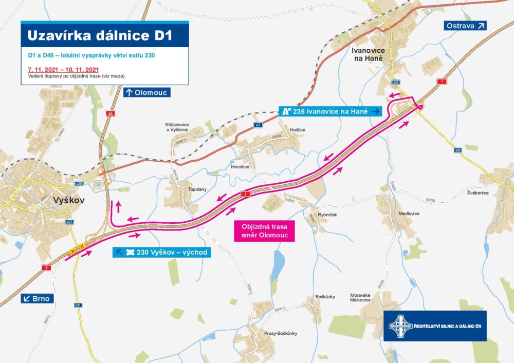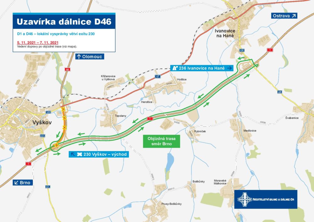 Upozorňujeme na částečnou uzavírku dálnic D1 a D46, kde budeme v termínu od 5. 11. do 10. 11. realizovat lokální vysprávky větví EXITu 230.