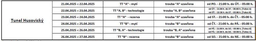 Jarní údržbové práce v brněnských tunelech míří do finále! Tento týden přijde na řadu poslední Husovický tunel. Pracovat zde budeme během nočních uzavírek vždy od 21:00 do 5:00. Začínáme dnes večer a skončíme v neděli ráno v 5:00. Další údržba nás čeká v říjnu.