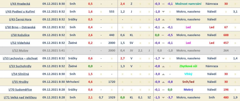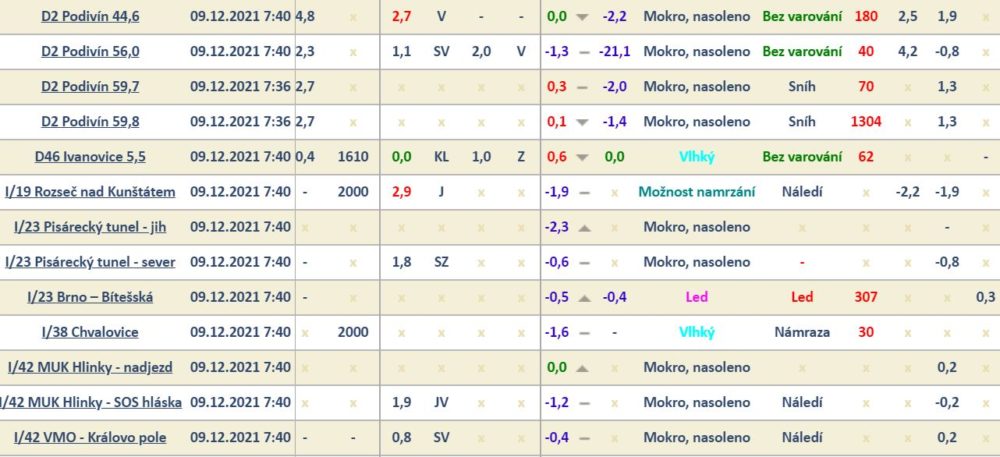Území Jihomoravského kraje dnes zasáhlo dle předpovědi Českého hydrometeorologického úřadu vydatné sněžení. Dálnice a silnice I. tříd jsou aktuálně po chemickém ošetření sjízdné se zvýšenou opatrností! Na většině území přetrvávají sněhové přeháňky. Teplota se pohybuje pod bodem mrazu. Upozorňujeme řidiče na riziko tvorby námrazy a náledí. Velmi opatrnou jízdu doporučujeme na dálnici D1 v km 190 – 241. Pozor na namrzání na nadjezdech! Varování před rizikem namrzání a vzniku náledí platí pro řadu úseků silnic I. tříd v Jihomoravském kraji! Nohu z plynu dnes dejte určitě v na silnici I/54 u obce Silničná, I/55 Hrušky, I/53 Lechovice, 1/19 Rozseč nad Kunštátem a silnici I/43 Černá hora, Podlesí u Kuřimi.