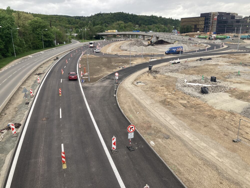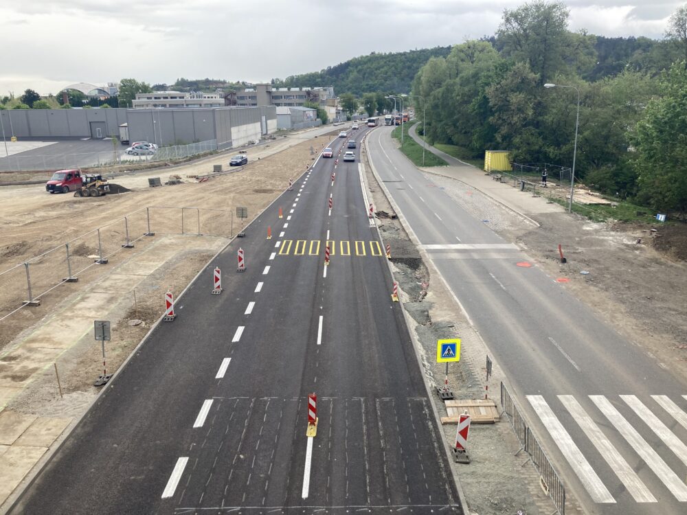 Po novém asfaltovém povrchu silnice I/42 v ulici Bauerova v Brně řidiči jezdí od poloviny dubna a zhotovitel pracuje na 2. polovině komunikace. Převedení provozu na pravou polovinu (ve směru k MÚK Pražská radiála) umožnilo zahájení kompletní rekonstrukce stávající I/42 (blíže areálu Riviéra). Do původní vozovky se ihned pustily frézy. Zároveň byl umožněn sjezd na I/42 ze směru od Pisáreckého tunelu. Nadále pokračují práce na stavbě lávky Velodrom, u níž probíhá budování bočních opěr. Pokračují terénní úpravy či práce na stavbě nové okružní křižovatky.