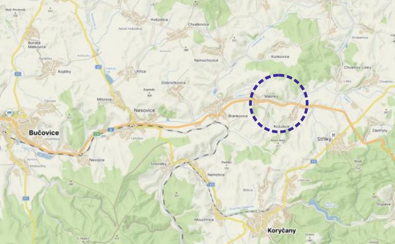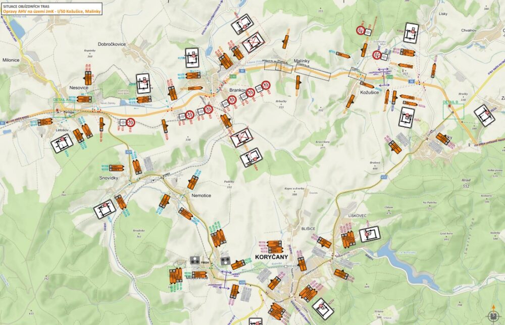 V Kožušicích bude silnice uzavřena pro osobní vozidla, motocykly a cyklisty (mimo dopravní obsluhu). Objízdná trasa pro osobní dopravu povede ze silnice I/50 v Nesovicích po II/429 přes Snovídky, Nemotice a Mouchnice, přes Koryčany a Střílky, odkud se napojí zpět na I/50. Objížďka bude platit v obou směrech – směrem na Uherské Hradiště i Brno.