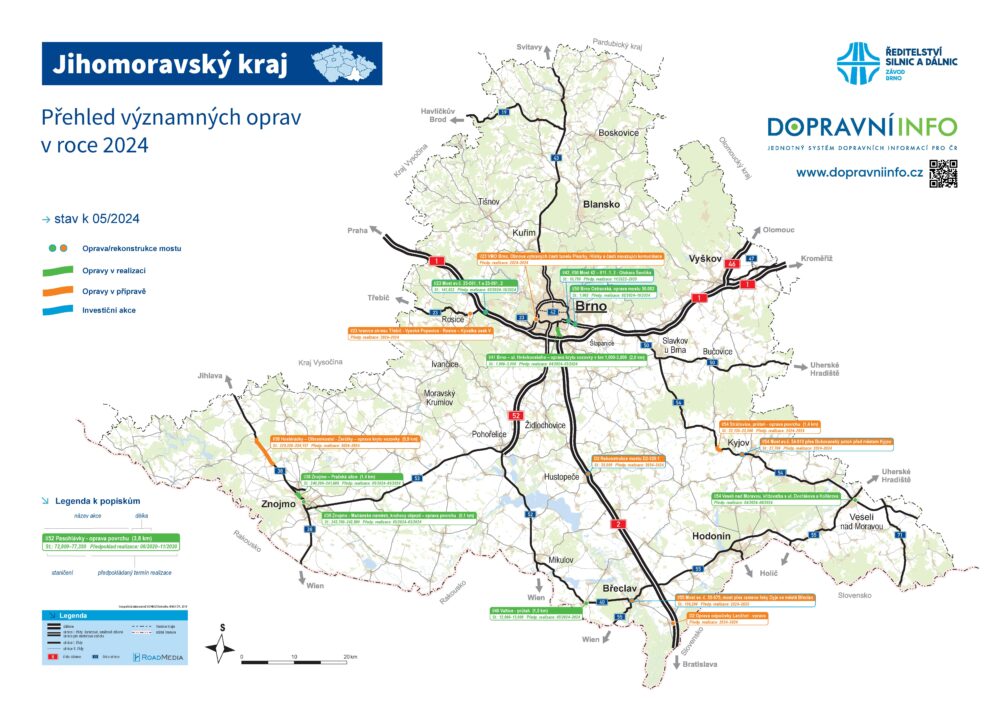 Nabízíme k nahlédnutí přehled plánovaných a realizovaných oprav na území Jihomoravského kraje. Včera jsme na jihu zahájili celkem tři akce, a to ve Valticích a ve Znojmě. Příští týden 12. května dokončíme opravu v ulici Hněvkovského v Brně.