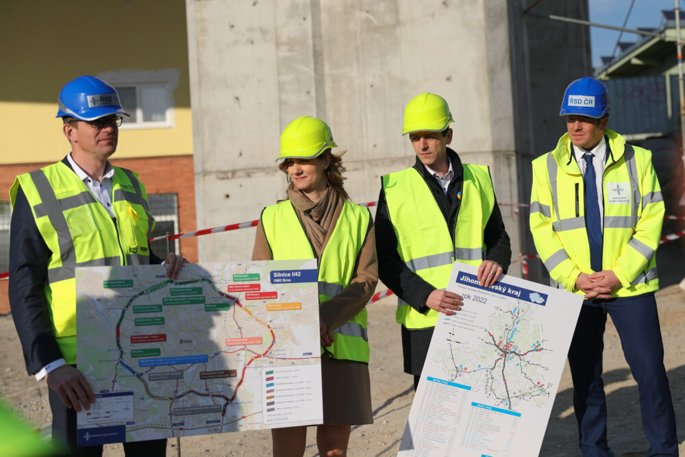 Ministr dopravy Martin Kupka, hejtman Jihomoravského kraje Jan Grolich a primátorka města Brna Markéta Vaňková dnes navštívili stavbu I/42 Brno, VMO Tomkovo náměstí a VMO Rokytova a prohlédli si shora budovanou mostní estakádu.