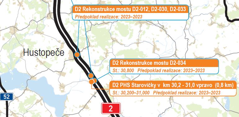 V letošní stavební sezóně plánujeme stavbu nové protihlukové stěny na dálnici D2 v km 30,2 – 31 u Staroviček, která bude dlouhá 800 m a vysoká 3,5 m. Nyní probíhá soutěž na zhotovitele stavby. Dále na dálnici D2 připravujeme rekonstrukci mostů u Staroviček a Hustopečí. Celkem půjde o čtyři mosty – poloviny. O začátku akcí budeme řidiče průběžně informovat.
