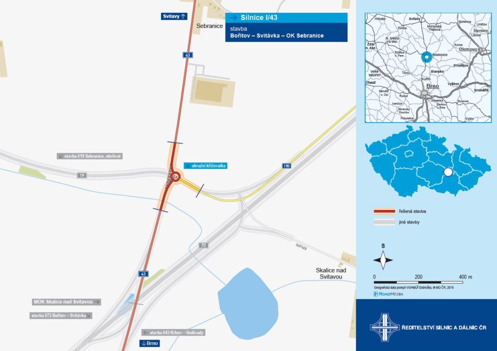 Na stavbě budoucí okružní křižovatky na silnici I/43 u Sebranic už probíhají přípravné práce, a to skrývka svrchní vrstvy půdy ze svahů komunikace. Provoz zatím není omezen. Realizaci hlavních stavebních prací předpokládáme v druhé polovině roku. Připravujeme soutěž na zhotovitele.