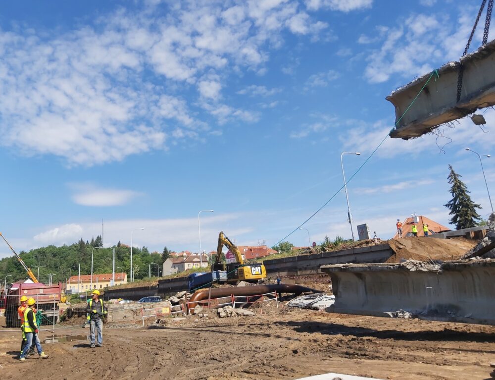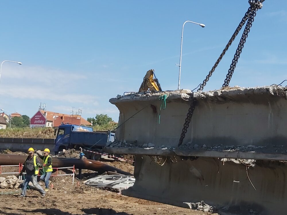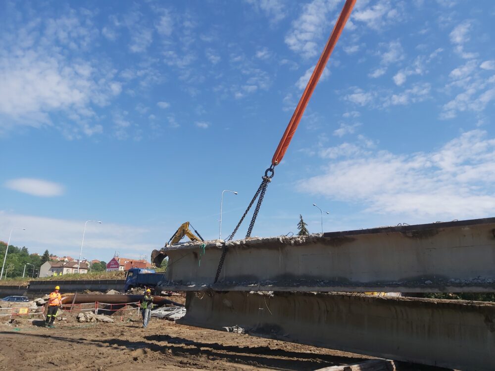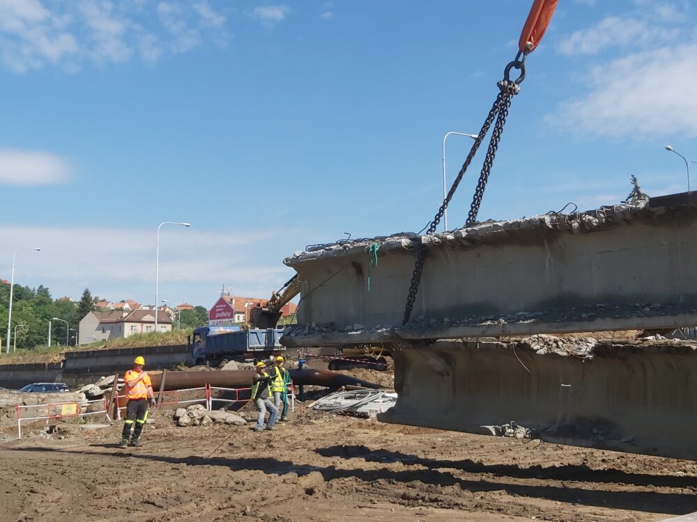 Největší automobilový jeřáb s teleskopickým ramenem, který je v ČR k dispozici, dnes snáší nosníky druhého pole pravé strany mostu nad řekou Svitavou u Tomkova náměstí v Brně. Nosníky na břehu rozebereme hydraulickými nůžkami. Betonový recyklát následně využijeme na stavbě.