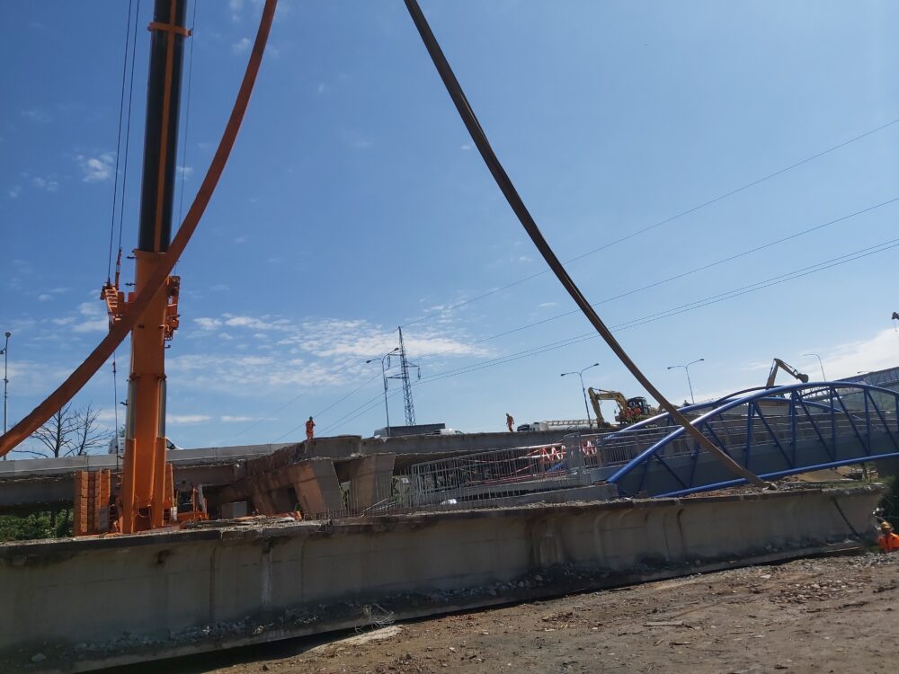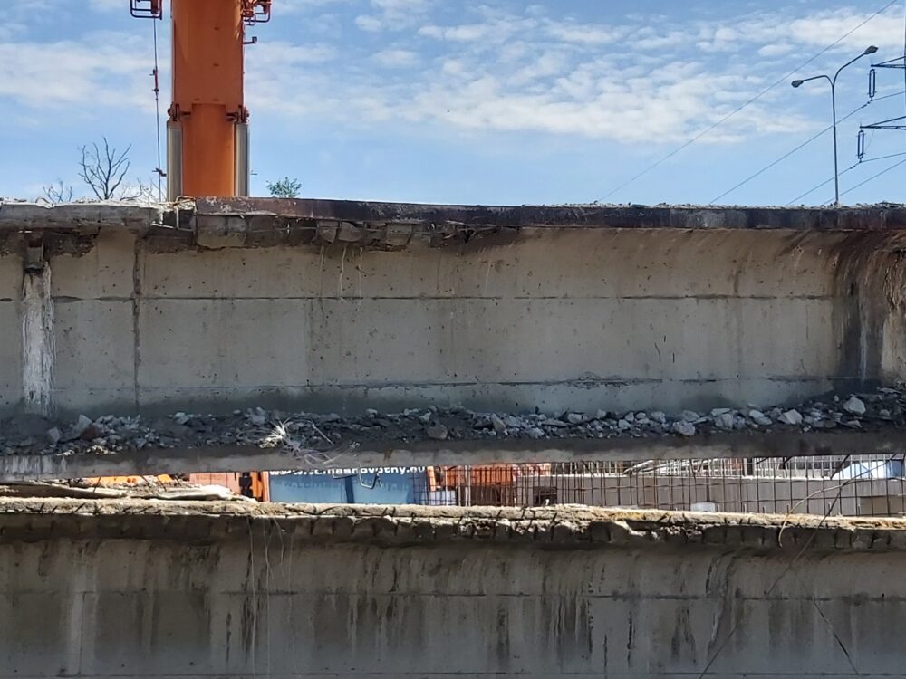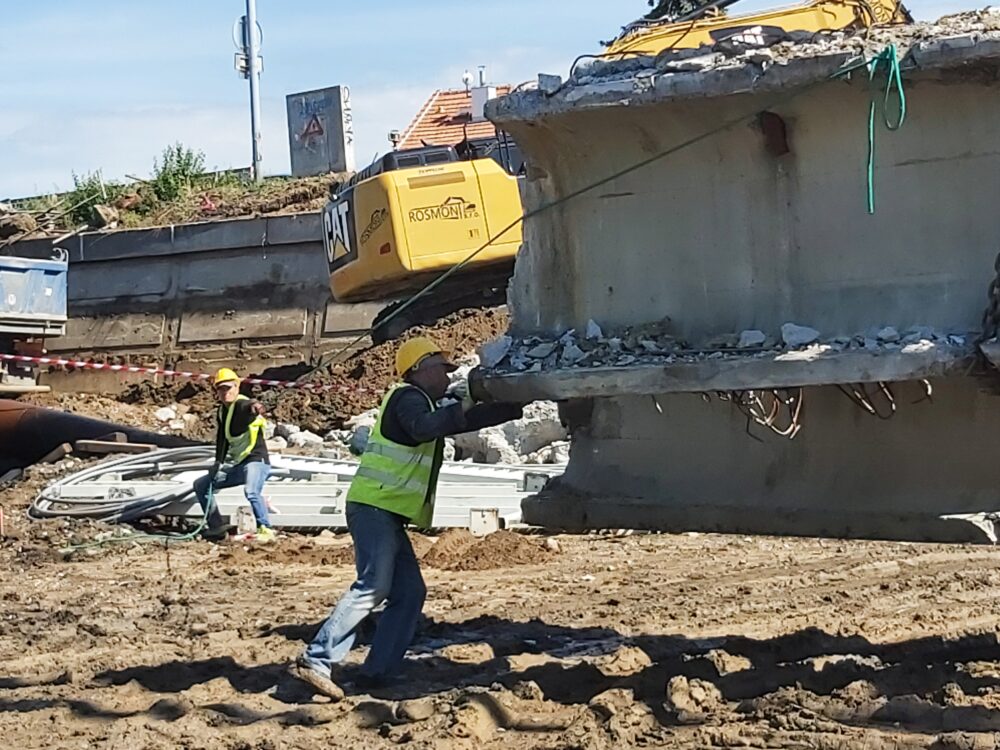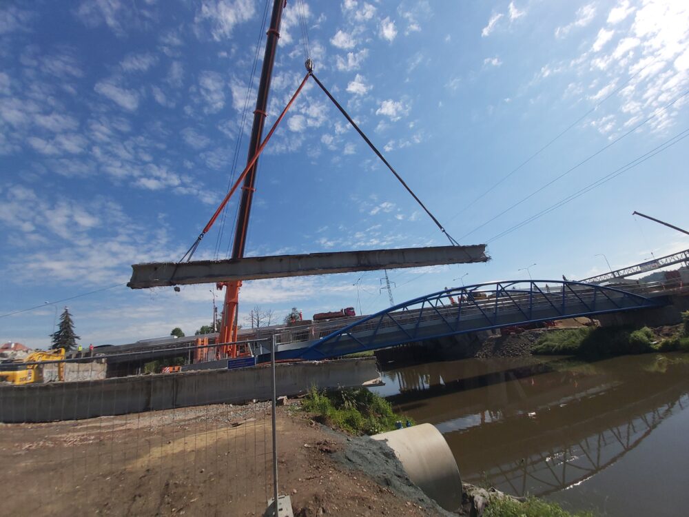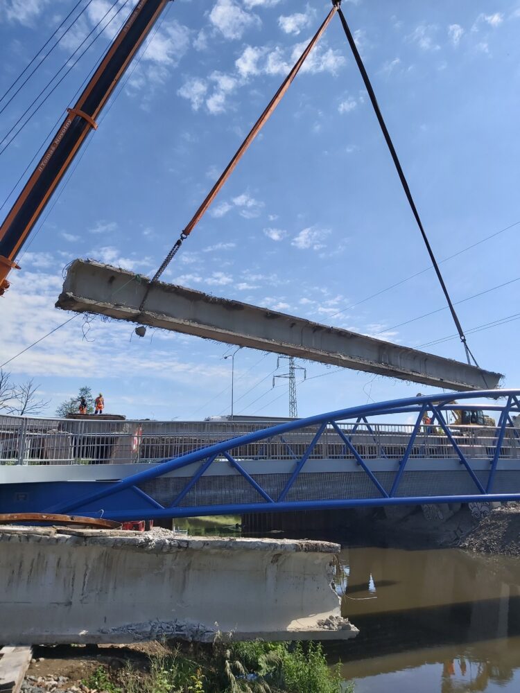 Největší automobilový jeřáb s teleskopickým ramenem, který je v ČR k dispozici, dnes snáší nosníky druhého pole pravé strany mostu nad řekou Svitavou u Tomkova náměstí v Brně. Nosníky na břehu rozebereme hydraulickými nůžkami. Betonový recyklát následně využijeme na stavbě.