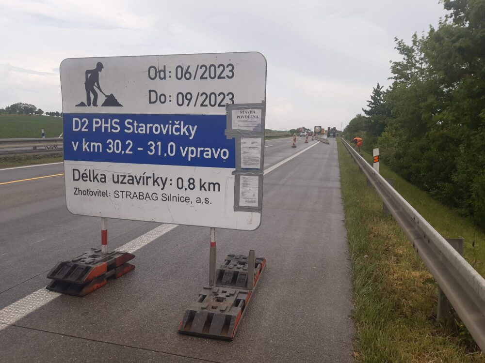 d) část pravého pásu dálnice v km 26,490–30,910 dne 19. 8. (07:00–18:00) kvůli realizaci DIO pro etapu II. Provoz ve směru na Břeclav bude veden 1 jízdním pruhem.
