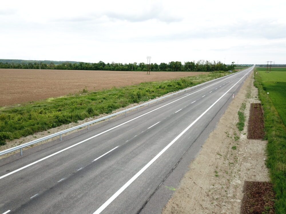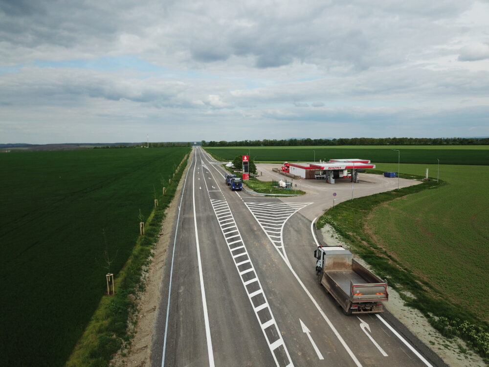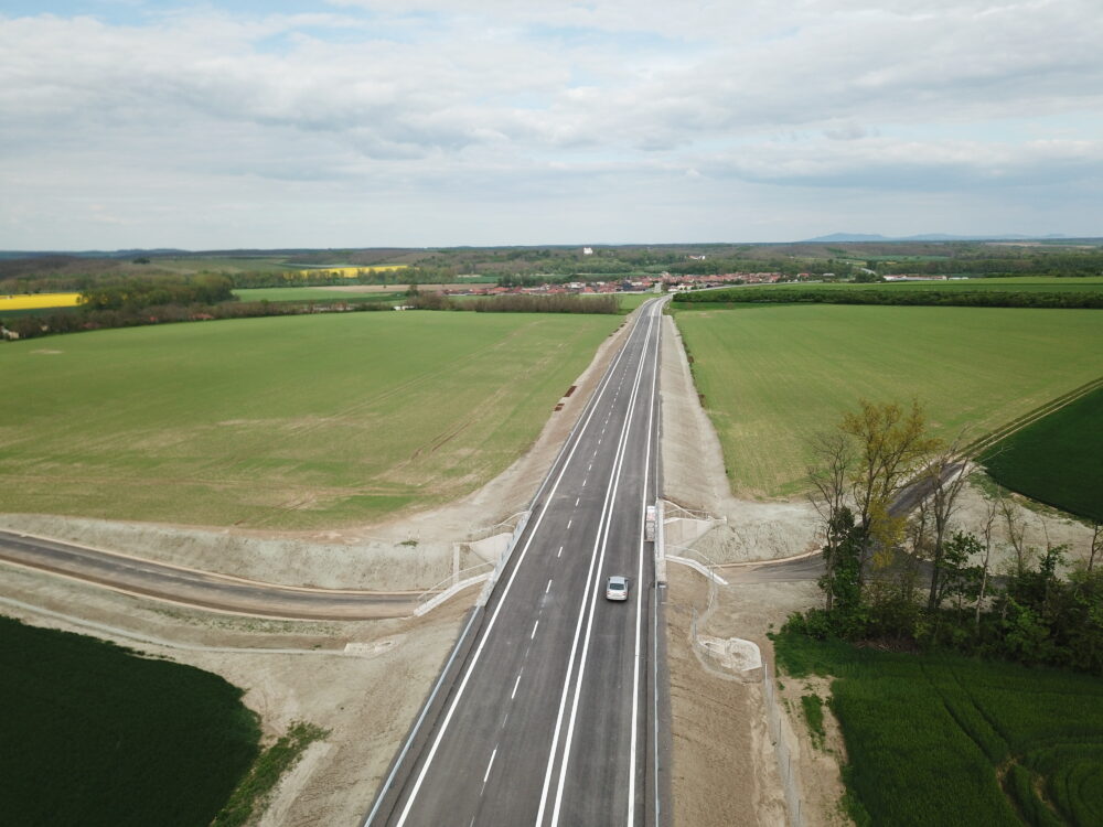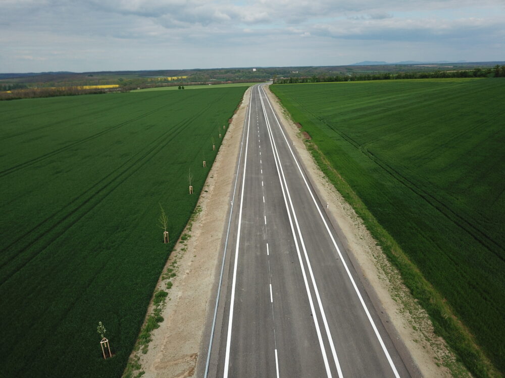 Pohled na stavbu I/53 Znojmo – Lechovice. Provedena byla kompletní přestavba v sedmikilometrovém úseku a rozšíření z 9,5 na 11,5 metru. V 1,5 km části byl ve směru na Znojmo přidán jeden jízdní pruh.