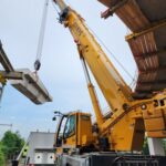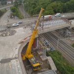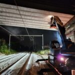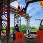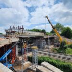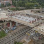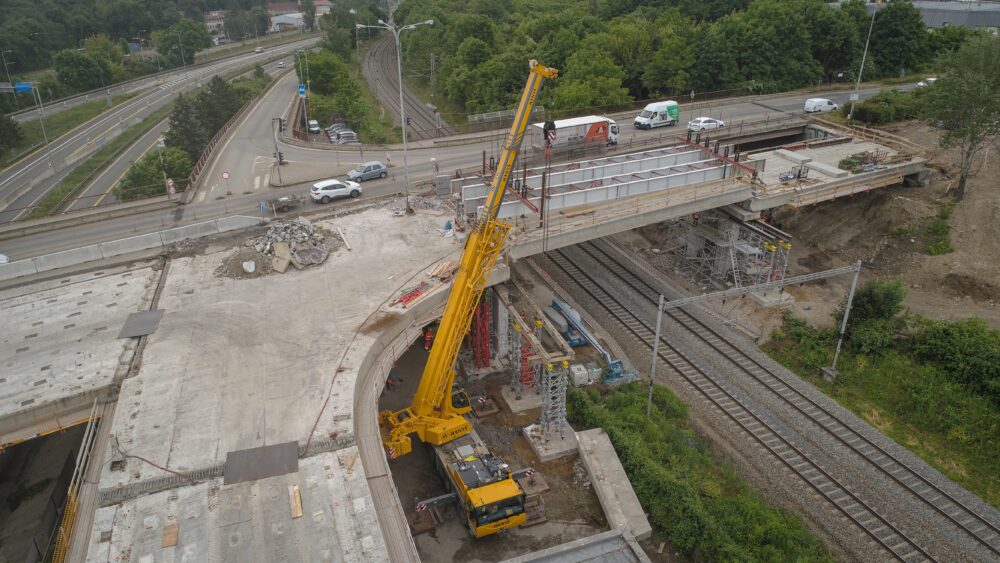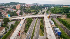 Přinášíme pohled na opravovaný most Otakara Ševčíka v Brně viz foto níže. Během krátkodobých nočních výluk proběhlo pískovaní spodního povrchu nosné konstrukce, dále například výstavba podpěrné skruže pro armovaní a betonáž nových monolitických stativ, výsun uříznutých stativ a následné snášení jeřábem. Dokončení opravy předpokládáme ve roce 2024.