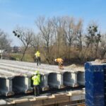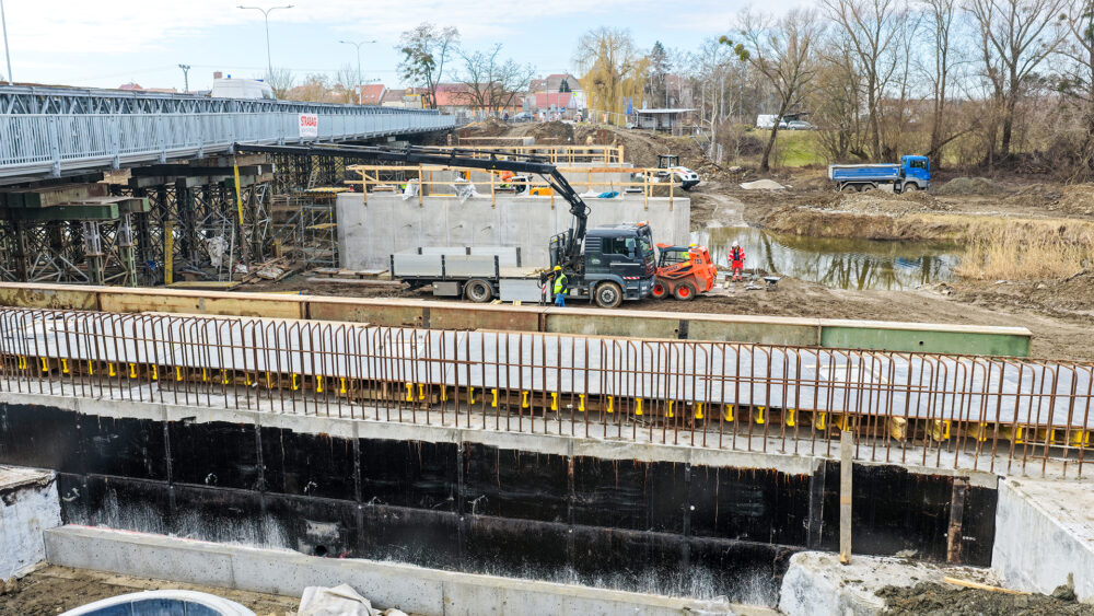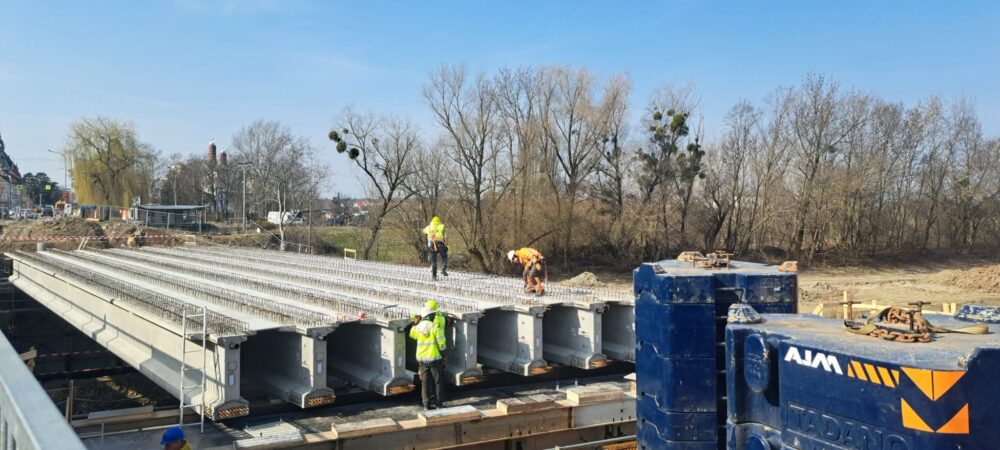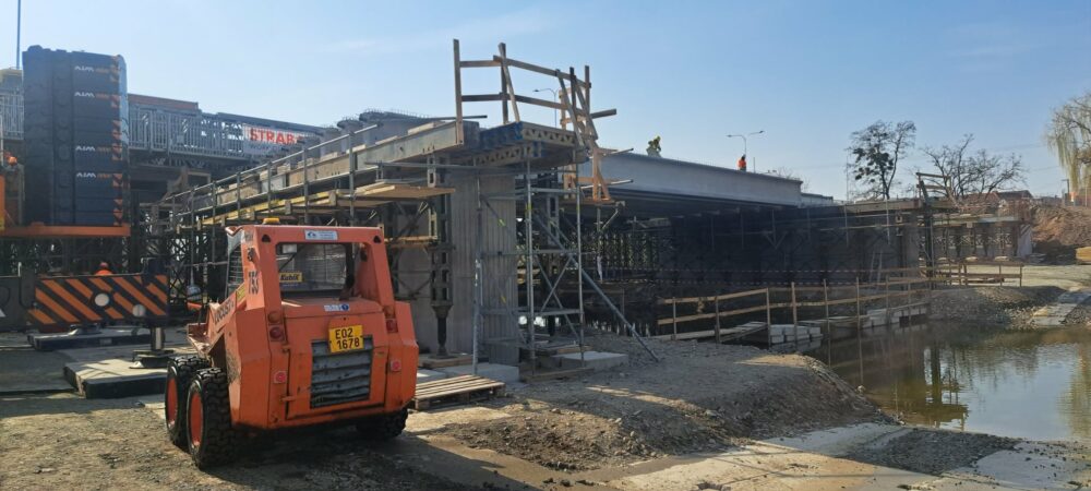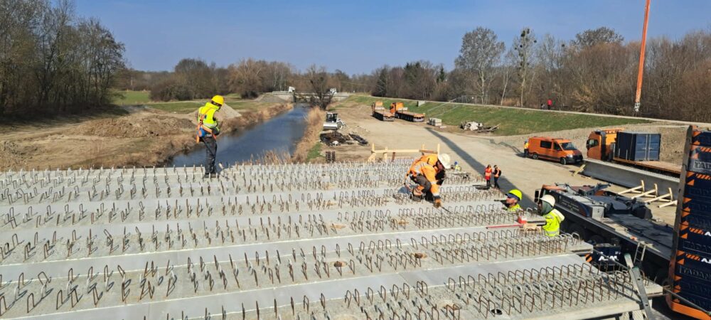 „Výstavba mostu pokročila do fáze, kdy je kompletně dokončena spodní stavba až po úroveň úložných prahů. Do 17. března budeme osazovat prefabrikované nosníky. V každém poli je navrženo 12 nosníků, celkem tedy osadíme 36 kusů. Každý z nich váží přibližně 36 tun a na stavbu je budeme dopravovat jednotlivě z naší výrobny prefabrikátů v Seredi. K jejich instalaci využijeme mobilní jeřáb s nosností 450 tun, který umožní jejich bezpečné a přesné usazení přímo do definitivní polohy na předem připravené podložky podpěrné konstrukce. Montáž bude probíhat systematicky – začneme ve středním poli mostu a následně budeme pokračovat do krajních polí. V každé fázi bude nutné přestavění jeřábu tak, aby byl zajištěn optimální dosah. Následovat budou armovací a bednicí práce na příčnících a na spřažené desce nosné konstrukce a poté betonáž nosné konstrukce. Po dosažení předepsané pevnosti betonu přistoupíme k dopnutí kabelů spojitosti,“ popsal harmonogram prací stavbyvedoucí Jan Doruška ze společnosti Strabag.