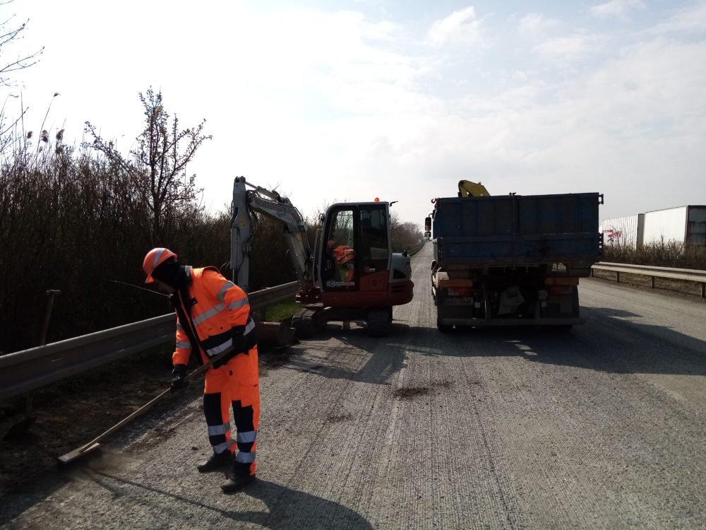 Aktuální pohled na opravovaný – 5,4 km dlouhý úsek silnice I/50 u obce Bavory. Vozovku již máme odfrézovanou, nyní probíhá dočistění krajnic, pokládka asfaltových vrstev a betonových obrub na ostrůvcích. Hotovo budeme mít v půlce května. Řidiči stále projedou po neopravované straně vozovky a částečně po vedlejší obslužné komunikaci. Děkujeme za trpělivost.