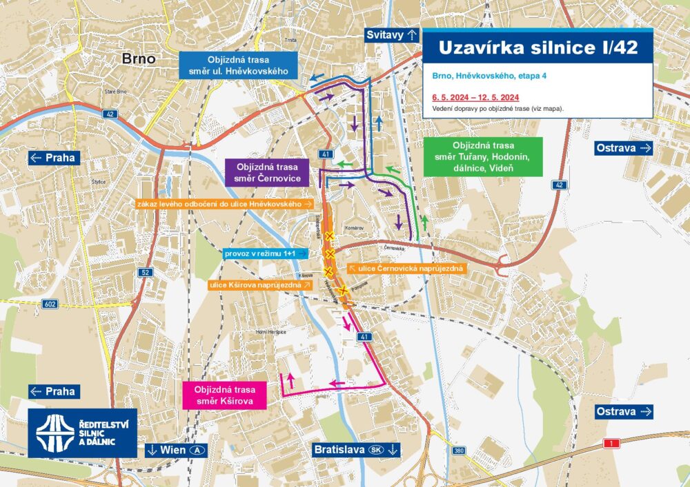 Během uzavírky je neprůjezdná křižovatka Hněvkovského – Černovická, a zákaz levého odbočení z ulice Za Mostem do ulice Hněvkovského. Ulice Kšírova je neprůjezdná z důvodu zákazu vjezdu v křižovatce s ulicí Hněvkovského. Dokončení prací plánujeme 12. května.