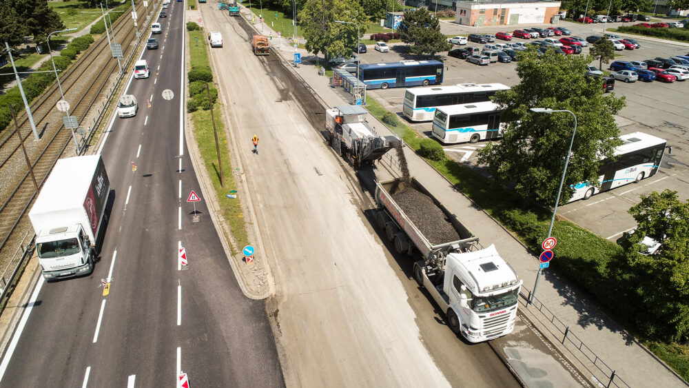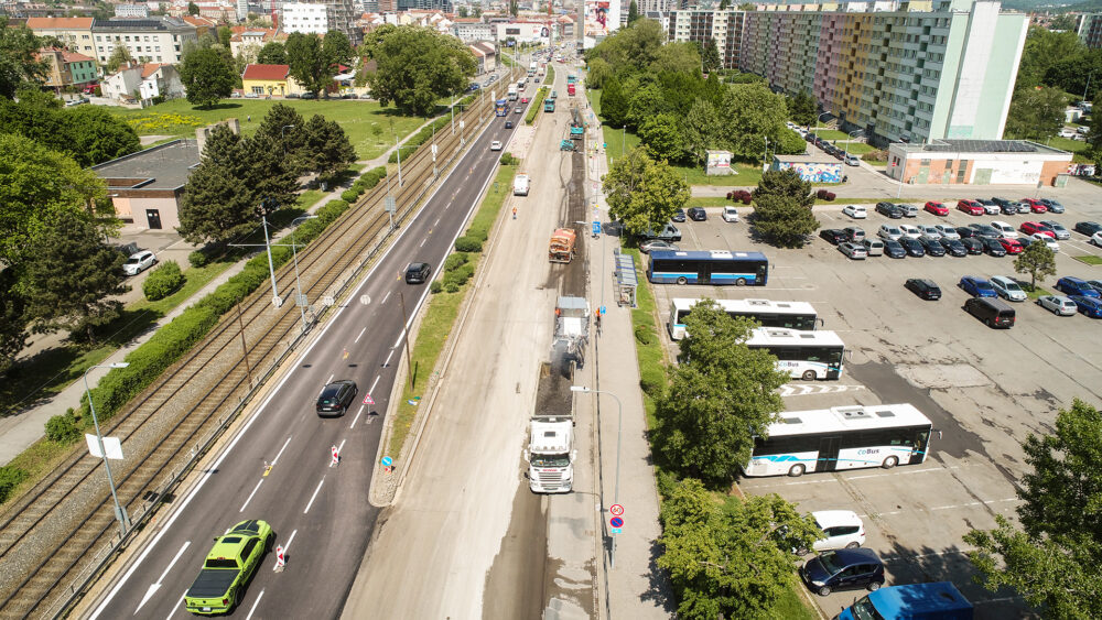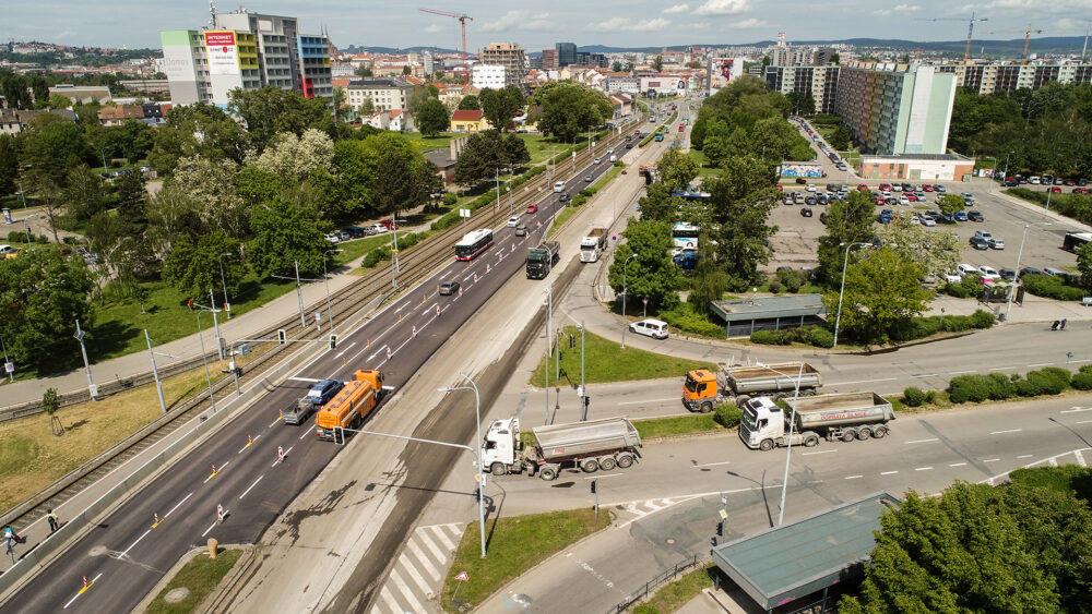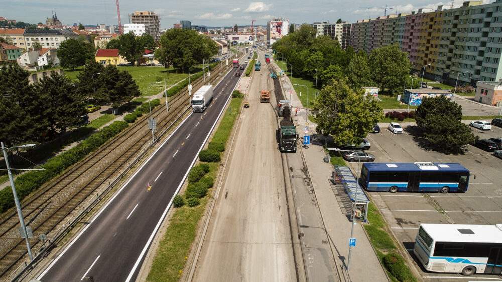 Oprava silnice I/41 v ulici Hněvkovského v Brně pokročila do finální etapy. Po celé délce stavby je stále zachován obousměrný provoz v režimu 1+1. Uzavřen je úsek od železniční trati po ulici za Mostem ve směru na centrum.