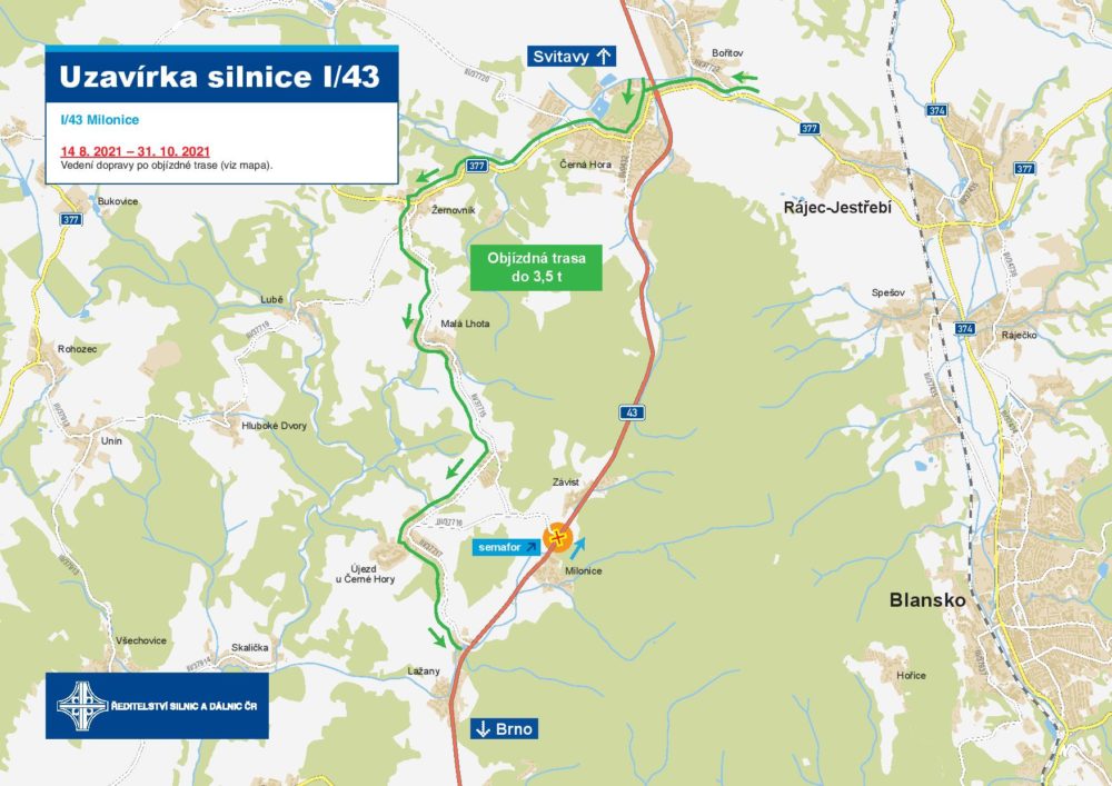 Během víkendu jsme zahájili práce na silnici I/43 u obce Milonice, kde vybudujeme odbočovací pruh na křižovatce k obci Závist. Současně opravíme úsek silnice I/43 mezi obcemi Milonice a Lažany. Ve směru ze Svitav na Brno již počítejte s uzavírkou, která potrvá do října. Pro vozidla do 3,5 t je určena objízdná trasa přes Černou Horu, Žernovník, Malou Lhotu a Újezd u Černé Hory do obce Lažany. Veškerá nákladní doprava a autobusy zůstanou na silnici I/43 v obou směrech, uzavírka ani objížďka se jich netýká. Dopravu v úseku stavebních úprav řídí semafory. Děkujeme za trpělivost!