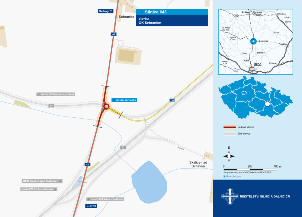 Pokládku asfaltových vrstev máme hotovou v části budované okružní křižovatky na silnici I/43 u Sebranic. Od pondělí 9. října na novou křižovatku převedeme provoz a budeme pracovat na připojovacích větvích a demontáži provizorní komunikace. Z důvodu těchto prací bude nutné zavést kyvadlový provoz, který budou řídit semafory. Kompletní dokončení prací plánujeme již začátkem listopadu.